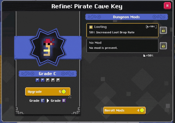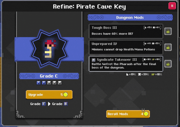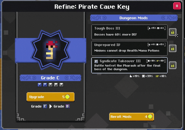 The key refine UI has been completely redesigned, this UI can be accessed from the key. The screen is divided into different sections, one focused on the grade and another on the dungeon mods. In this screen, several actions can be done: